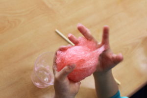 子ども達はスライム作りに挑戦しました。水がだんだん固まっていく様子に歓声を上げて不思議がっていました。