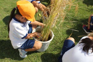 本日、5月から育ててきたバケツ稲の稲刈りを行ないました。子だもたちはハサミで自分の稲を切って