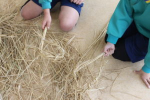 13日にバケツ稲のわらを利用して、正月飾りを作りました。とてもユニークで素敵な飾りが出来ました。